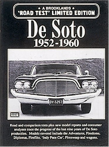 De Soto announced the new Firedome in 1952. The new V8 engine gave good cruising capabilities with comfort. Ghia designed a new Adventurer for 1954. A convertible was introduced in 1956 with a sportier look and more power. The body was drastically re-styled for 1957. The body was also completely new for 1960 with the switch to unit bodyframe construction. The 383 engine was available for the Adventurer models. This is a book of contemporary road and comparison tests, model introductions, consumer analysis, technical and specification data, and driver’s impressions. Models include: FireDome 8, Powermaster 6, Adventurer, FireFlite, Indy Pace Car, Firesweep, Diplomat, Wagons.