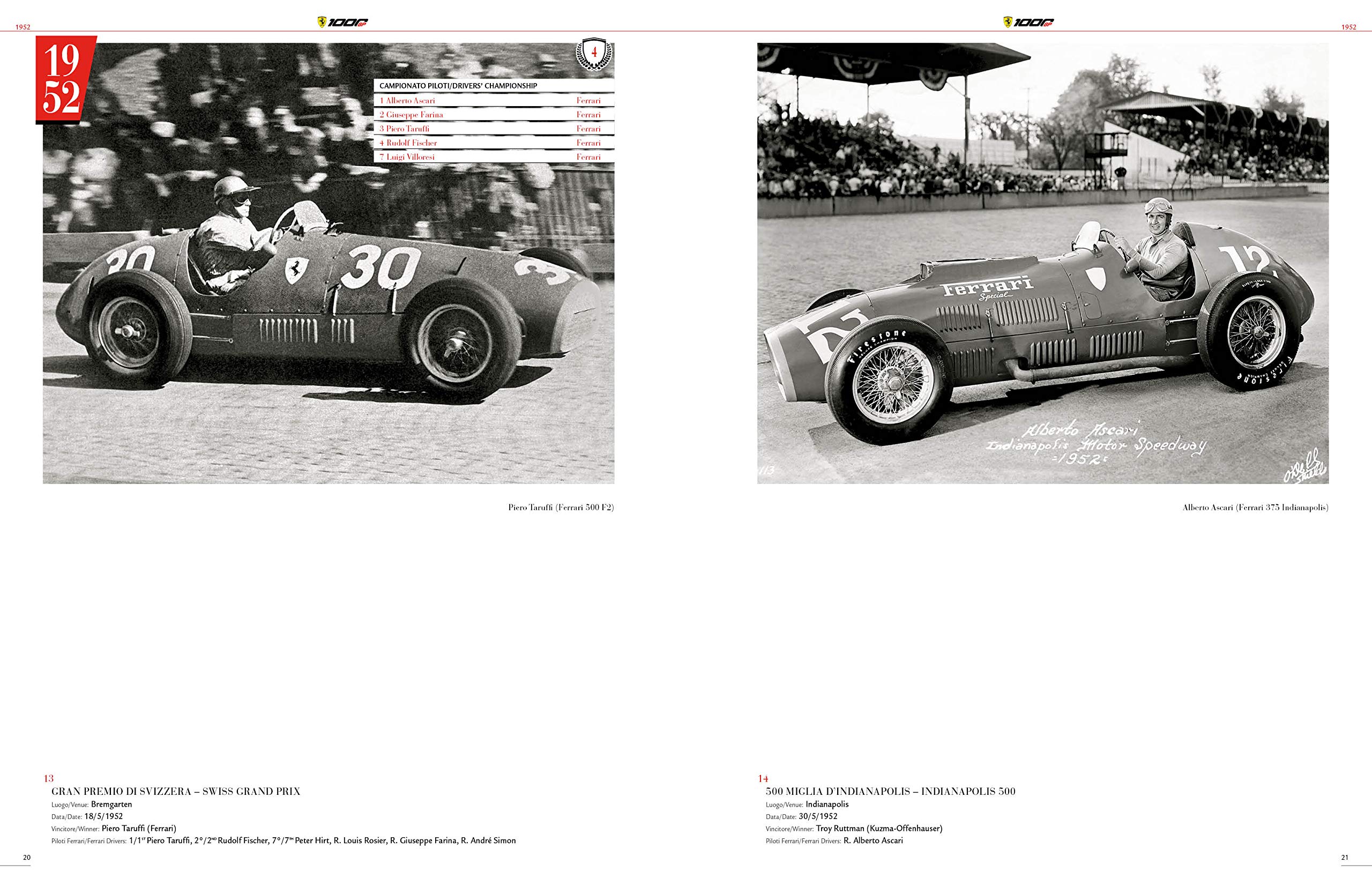 Made in collaboration with Ferrari Spa and available in a limited edition of 2,000 copies, the book is contained in an exclusive slipcase in “Rosso Storico 127”, the same colour as the 125 S, the first Ferrari from 1947, and the SF1000, which in 2020 competed in the Scuderia’s 1,000th Grand Prix on the Mugello circuit. An indispensible volume for the bookshelves of all enthusiasts of the Prancing Horse: a precious collector’s item as well as an invaluable source of information regarding the results obtained by the cars from Maranello in every race and the team’s placings in the Drivers’ and Constructors’ championships.