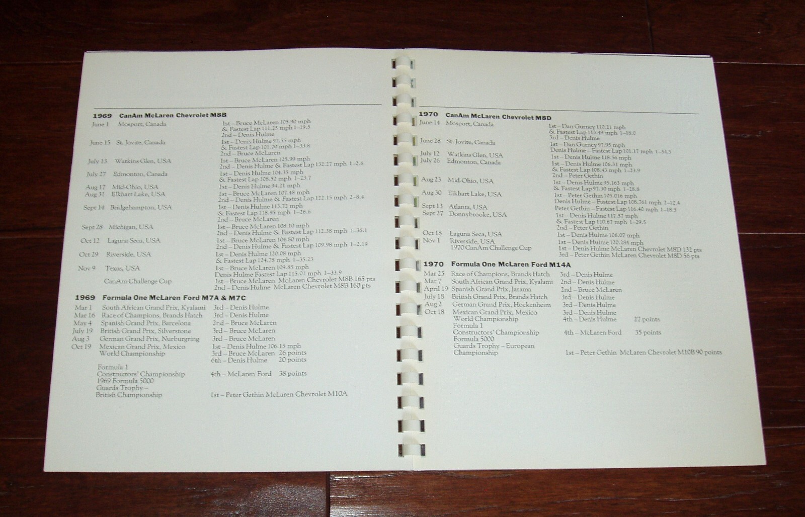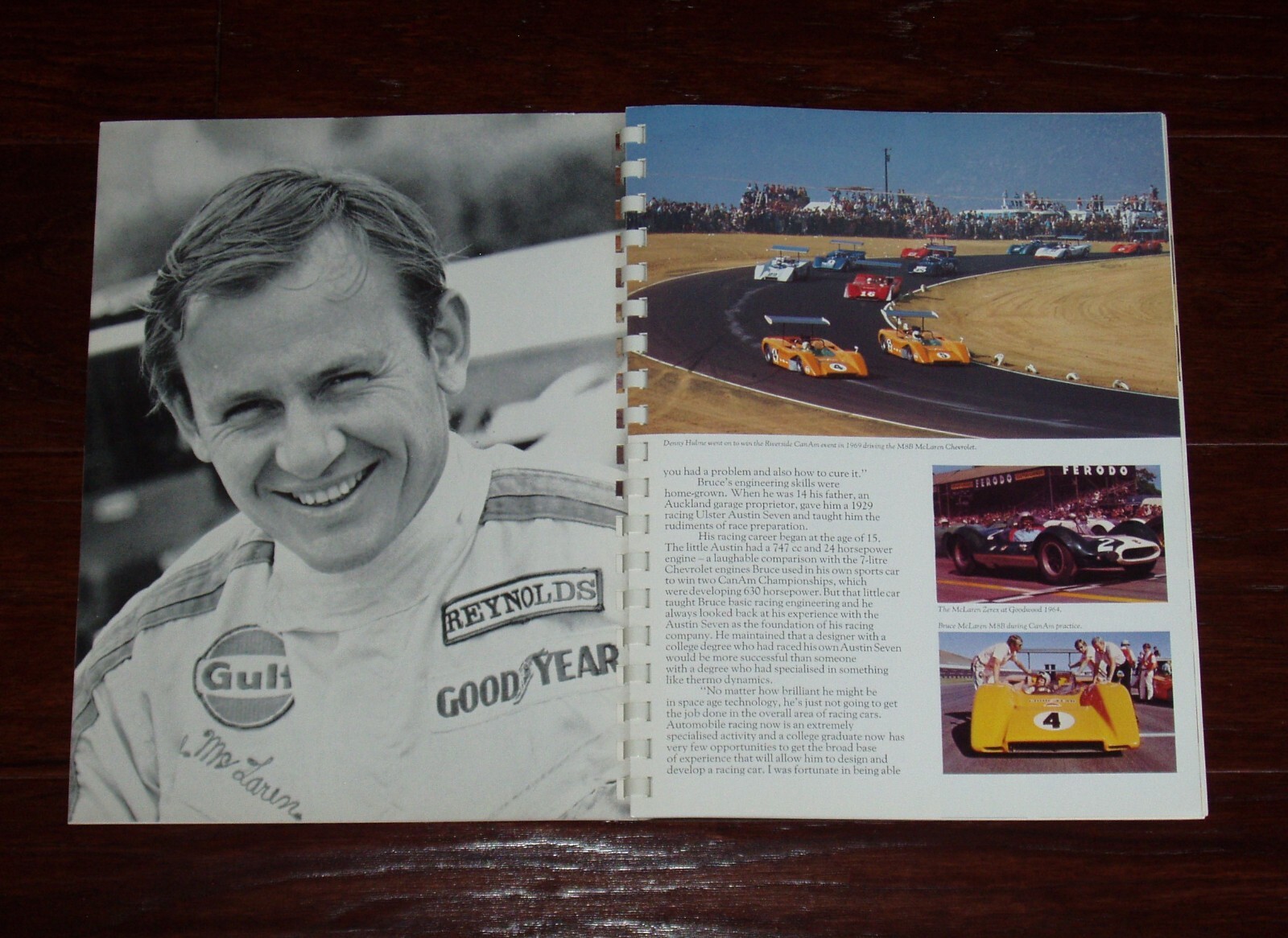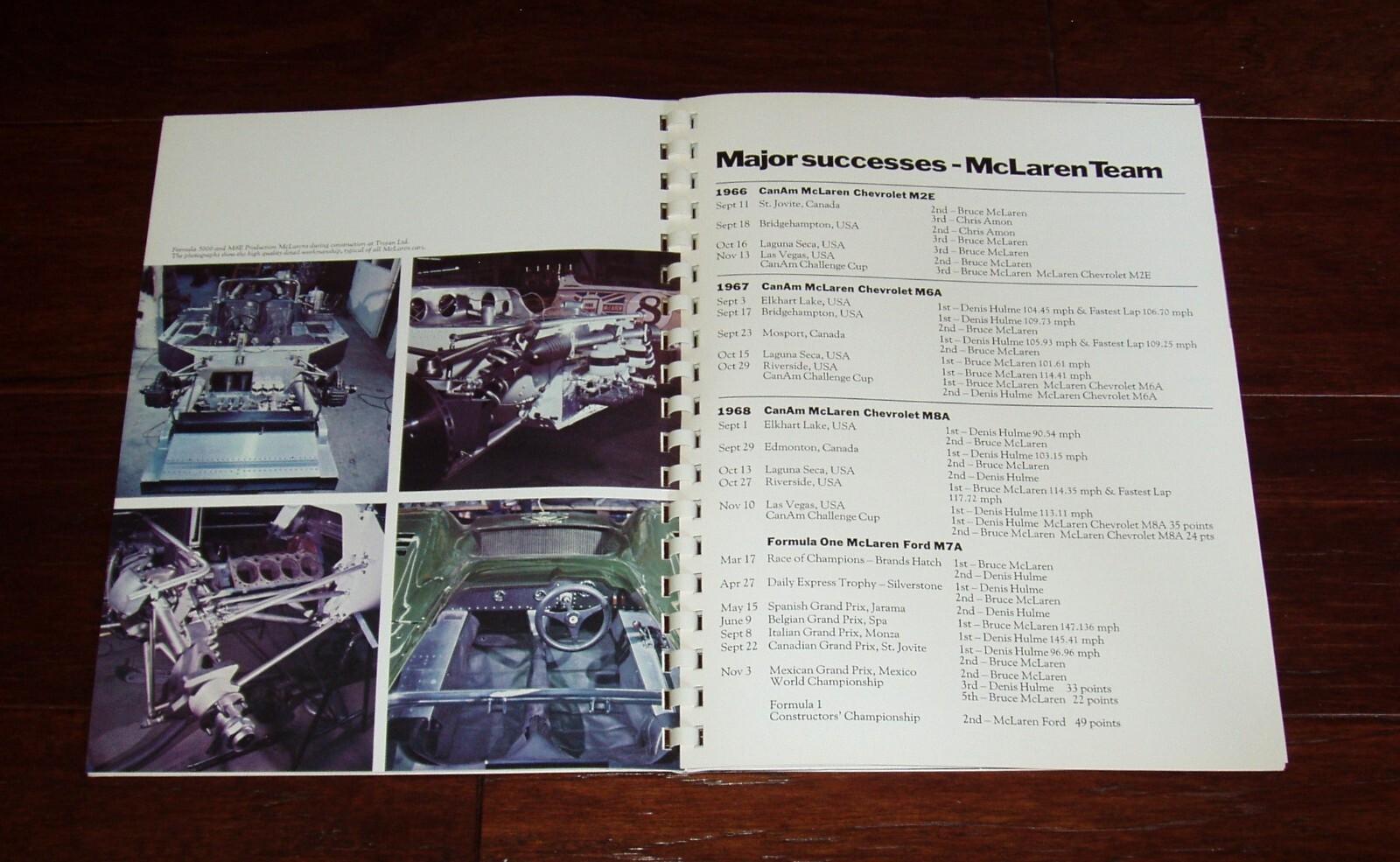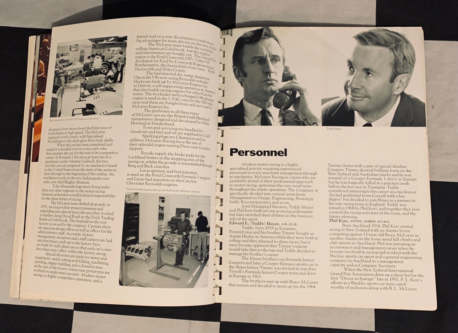 THIS VERY RARE ITEM IS AN ORIGINAL COMPANY/ TEAM BROCHURE PRODUCED BY McLAREN RACING TO SHOWCASE THEIR MOTORSPORT INVOLVEMENTS FOR 1971. THROUGHOUT THE 42 SPIRAL-BOUND PAGES, THE BROCHURE COVERS INFORMATION ABOUT McLARENS HISTORY (1966-1971), CARS, DRIVERS, RESULTS, FACILITIES AND IN ADDITION THIS EDITION HAS AN OBITUARY TO BRUCE McLAREN HIMSELF FOLLOWING HIS TRAGIC DEATH THE PREVIOUS YEAR. THE TEXT IS COMPILED BY EOIN YOUNG AND IS ACCOMPANIED BY SOME FANTASTIC PHOTOGRAPHS, SOME NEVER SEEN BEFORE. THESE BROCHURES WERE ORIGINALLY ONLY ISSUED TO TEAM PERSONNEL, SPONSORS AND LEADING MEMBERS OF THE PRESS; THEREFORE ARE INCREDIBLY HARD TO FIND – A MUST HAVE FOR ANY McLAREN FAN!